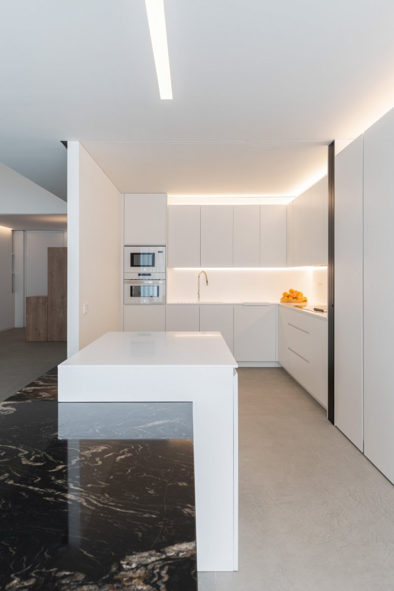 En la planta baja se desarrollan las actividades principales de zona de día de la vivienda, mientras que en la primera y segunda planta y alrededor de la doble altura, se van disponiendo los dormitorios, sala de cine y gimnasio.