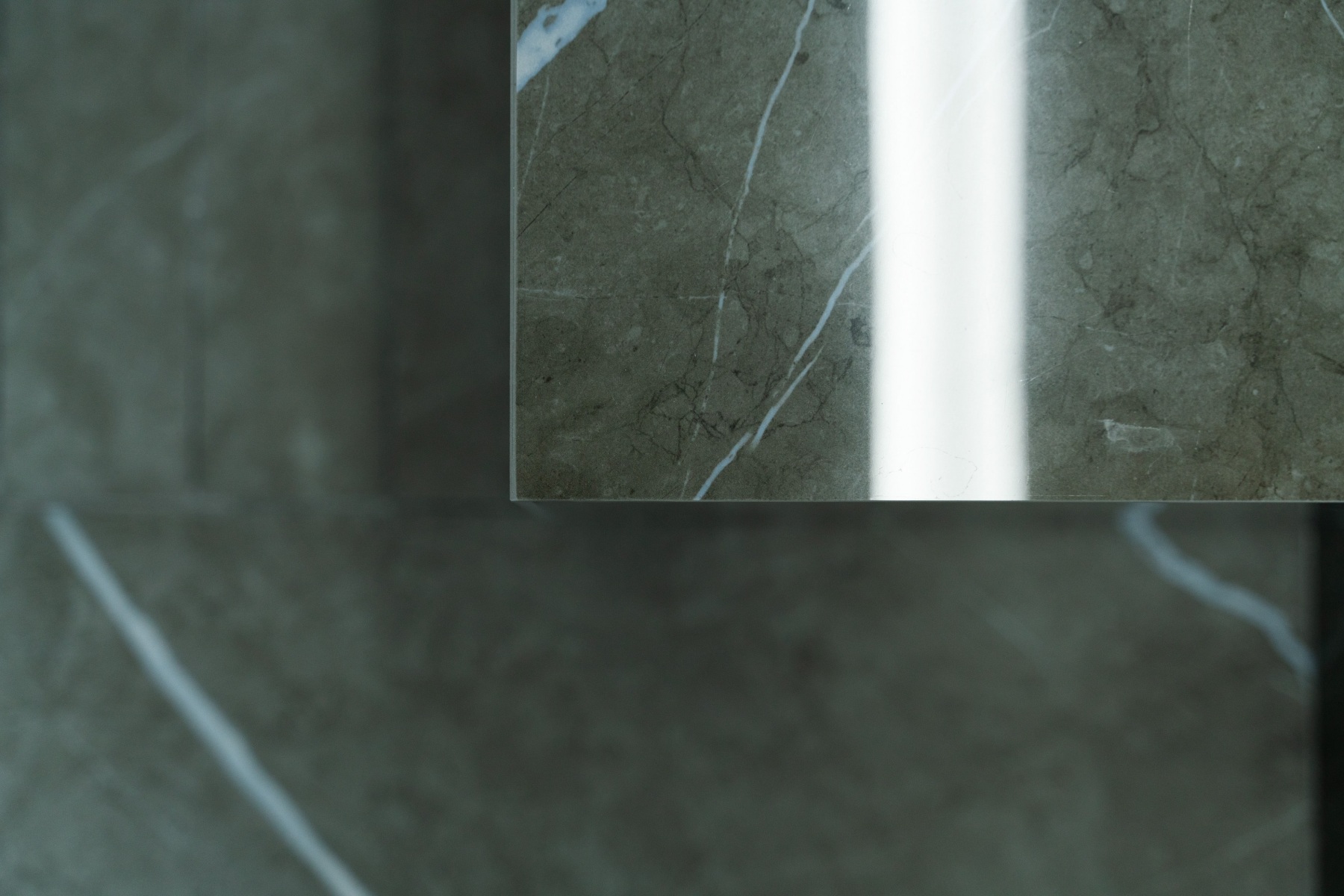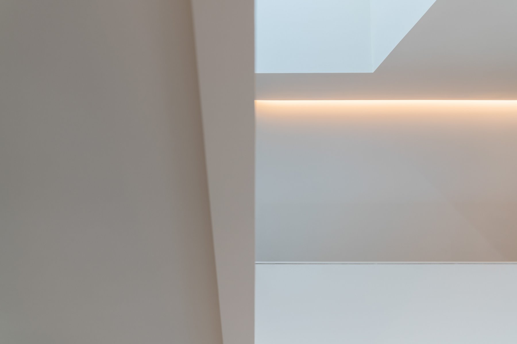 En los extremos de la fachada, para dar sensación visual de franjas completas se realizan pliegues a 30 y 60 grados. Además se juega con franjas de vidrio y macizo blanco de diferentes medidas en altura para romper la fachada y dar la sensación visual de que tenemos más plantas de las que realmente hay.